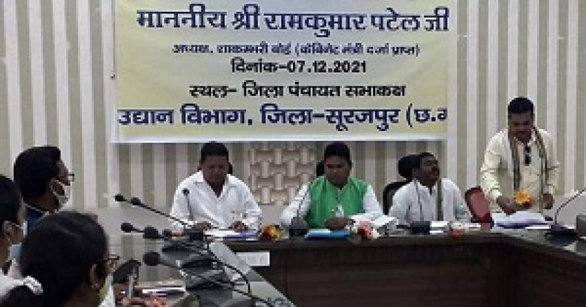 छत्तीसगढ़ शाकम्भरी बोर्ड अध्यक्ष रामकुमार पटेलएवं सदस्य पवन पटेल, दुखवा पटेल एवं हरि पटेल ने आज सूरजपुर जिले में उद्यानिकी विभाग के अधिकारियों की बैठक लेकर विभागीय योजनाओं एवं कार्यक्रमों की प्रगति की समीक्षा की। बैठक में शाकंभरी बोर्ड के अध्यक्ष ने शासन के मंशा अनुसार उद्यानिकी विभाग की योजनाओं एवं कार्यक्रमों का लाभ लघु सीमांत कृषकों को दिलाने के निर्देश विभागीय अधिकारियों दिए।