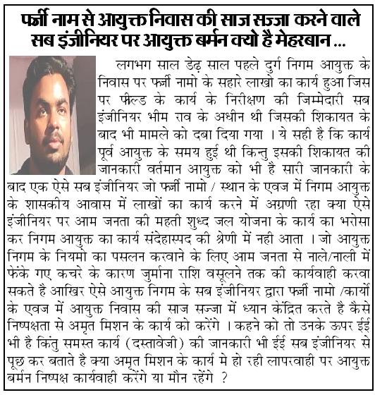वर्तमान में दुर्ग निगम क्षेत्र में पाइप फिटिंग के बाद फिलिंग का कार्य युद्ध स्तर पर चल रहा है जिसमे कार्य एजेंसी द्वारा शहर के ठेकेदारों को पेटी कांट्रेक्ट में कार्य देने का मामला सामने आ रहा है किंतु इसे चतुराई से लेबर कांट्रेक्ट का रूप देकर मामले को दबाया जा रहा है । कागजो में मजबूत अमृत मिशन के कार्य मे गुणवत्ताहीन कार्य के कई मामले उजागर हुई किन्तु निगम आयुक्त मौन , ईई मौन , इंजीनियर मौन और दुर्ग शहर की जनता परेशान ..