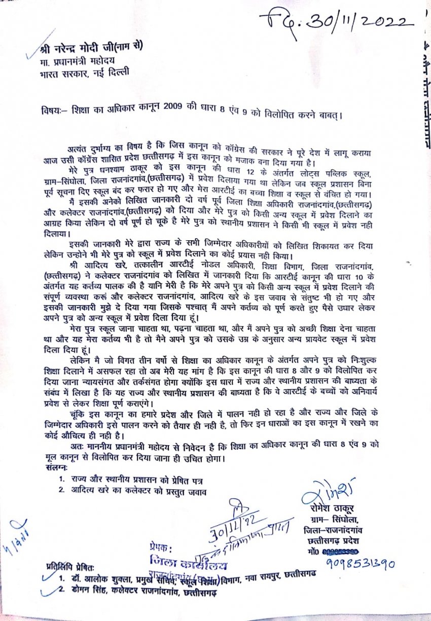 राजनांदगांव / शौर्यपथ / जिस कानून को कांग्रेस की सरकार ने पूरे देश मे लागू कराया वही कानून आज कांग्रेस शासित छत्तीसगढ़ में मजाक बन कर रह गया है। पीड़ित पालक रोमेश ठाकूर ने प्रधानमंत्री को अपनी पीड़ा पत्र लिखकर बताया है कि कैसे तीन वर्षो तक जिम्मेदार अधिकारीयों के समक्ष आग्रह करने के बावजूद उनके पुत्र को निःशुल्क शिक्षा दिलाने में वे असफल रहे। पीड़ित पालक प्रधानमंत्री को पत्र लिखकर आरटीई कानून की धारा 8 एंव 9 को विलोपित करने की मांग कर रहे है क्योंकि इस धारा का पालन प्रदेश और जिले के अधिकारी नही कराना चाहते है। शिक्षा का अधिकार कानून की धारा 8 एंव 9 में यह स्पष्ट उल्लेखित है कि बच्चों को अनिवार्य प्रवेश से लेकर शिक्षा पूर्ण कराने की बाध्यता राज्य और स्थानीय प्रशासन की है लेकिन जिम्मेदार अधिकारी ने इसे पालको का कर्तव्य बता कर अपने पदीय कर्तव्य को पूरा करने से बचते नजर आए। जब कोई भी प्रायवेट स्कूल बंद हो जाता है तो उसमें प्रवेशित आरटीई के बच्चों को अन्य स्कूल में अंयन्त्र प्रवेश दिलाने की पूरी बाध्यता स्थानीय प्रशासन की होती है लेकिन कोरोना काल वर्ष 2019 से लेकर 2021 तक लगभग 45 प्रायवेट स्कूल जिले में बंद हुए जिसमें लगभग 1500 आरटीई के बच्चे प्रवेशित थे, जिन्हे अंयन्त्र स्कूलों में प्रवेश दिलाने की पूरी जिम्मेदारी आरटीई नोडल अधिकारी आदित्य खरे की थी, लेकिन उनके पदीय कर्तव्यों के प्रति घोर लापरवाही बरतने के कारण आज वे बच्चे या तो शालात्यागी हो गए या मजबूरी में पैसे उधार लेकर किसी प्रायवेट स्कूल में मोटी फीस देकर पढ़ रहे है। जिम्मेदार अधिकारी आदित्य खरे ने लिखित में अपने उच्च अधिकारी कलेक्टर को जवाब दे दिया कि यदि कोई प्रायवेट स्कूल बंद हो गया है तो यह पालको का कर्तव्य है कि वे अपने आरटीई के बच्चों को किसी अन्य स्कूल में पैसे देकर पढ़ाए और उच्च अधिकारी ऐसे जिम्मेदार अधिकारी की इस तर्क से संतुष्ट भी है। वरना आज श्री खरे निलंबित तो जरूर हो गए होते या उन्हे उनके मूल पद में भेज दिया गया होता। वैसे भी आदित्य खरे का मूलपद प्राचार्य है और वे विगत 20 वर्षो से डीईओ कार्यालय में बाबूगिरी कर रहे और बीस वर्षो से बिना अध्ययपन कराए ही वेतन ले रहे है और जिला प्रशासन यह सब जानबूझकर भी होने दे रहा है।