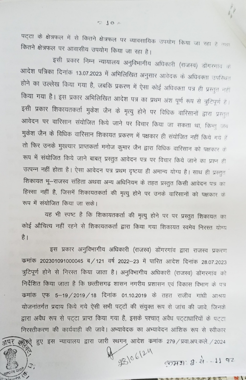 डोगरगाँव -डोगरगाँव नगर पंचायत में राजीव गांधी आश्रय योजना के अंतर्गत पट्टा वितरण में घोर लापरवाही उजागर हुआ है !डोगरगाँव के एक मामले में सुनवाई के दरम्यान न्यायालय अपरकलेक्टरराजनांदगांव के द्वारा राजीव गांधीआश्रय योजनामामलअनुविभागीय अधिकारी डोगरगाँव को नगर पंचायत मे वितरण किए गए समस्त पट्टों का पुनः जांच कर अवैध पट्टों को निरस्त किए जाने का निर्देश दिया है।