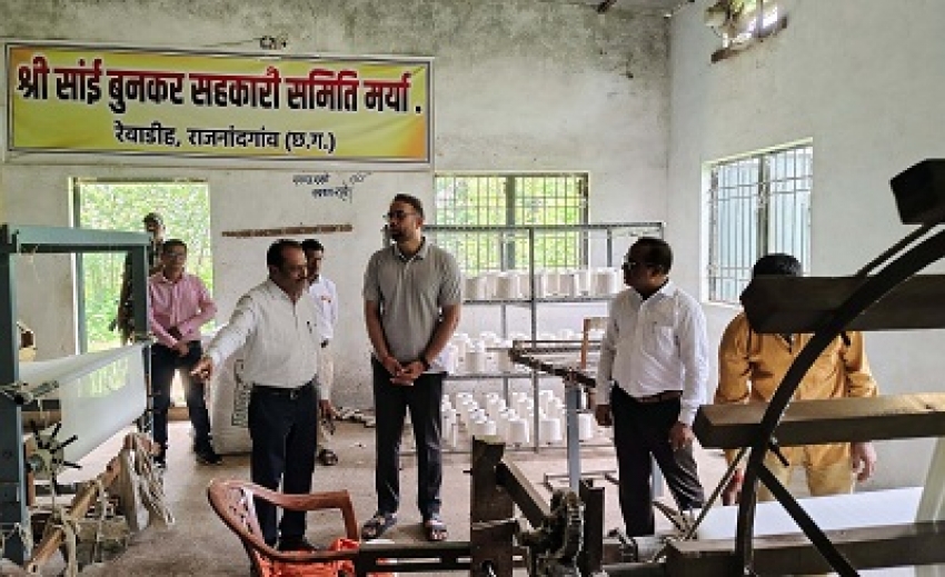 राजनांदगांव /शौर्यपथ / कलेक्टर डॉ. सर्वेश्वर नरेन्द्र भुरे ने राजनांदगांव विकासखंड के ग्राम रेवाडीह में संचालित श्री सांई बुनकर सहकारी समिति मर्यादित का आकस्मिक निरीक्षण किया। कलेक्टर ने बुनकर कर्मशाला भवन में समिति के बुनकरों द्वारा किये जा रहे गणवेश वस्त्र एवं अन्य वस्त्र उत्पादों का अवलोकन किया। उन्होंने बुनकरों से बुनाई संबंधी गतिविधियों का जायजा लिया। कलेक्टर ने बुनकरों से चर्चा कर प्रतिदिन किए जाने वाले उत्पादन तथा मासिक आय सहित अन्य विषयों के संबंध में चर्चा की।
