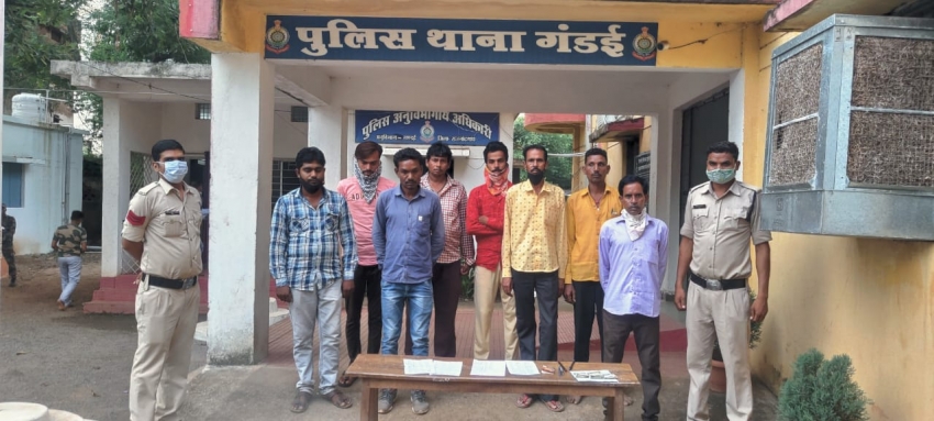 थाना गंडई क्षेत्रांतर्गत अलग-अलग गांव एवं स्थान से सट्टा लिखते हुये सटोरिये आत्मा राम धुर्वे पिता रामसिंग धुर्वे उम्र 36 साल निवासी पेंडरवानी के पास से 1520 रूपये, ओमकार पिता महादेव रजक उम्र 42 साल साकिन पेंडरवानी के पास से 1340 रूपये, वजीर अली पिता महरूम चांद अली उम्र 51 साल साकिन वार्ड नंबर 9 महामायापारा गंडई के पास से 1400 रूपये, शेख जाहिर पिता शेख सलीम उम्र 26 साल साकिन वार्ड नंबर पठानपारा गंडई के पास से 2200 रूपये, नीलकंठ पटेल पिता धुरवा पटेल उम्र 44 साल साकिन वार्ड नंबर 10 पटेलपारा गंडई के पास से 1080 रूपये, कलाम खॉन पिता महरूम अब्दुल रज्जाक उम्र 27 साल निवासी वार्ड नंबर 4 पंडरिया गंडई के पास से 850 रूपये, परमानंद यादव पिता अंजूर यादव उम्र 25 साल साकिन वार्ड नंबर 3 पंडरिया गंडई के पास से 920 रूपये, अकरम मिर्जा पिता चांद बेग मिर्जा उम्र 50 साल साकिन नर्मदा के पास से 2900 रूपये जप्त कर पकडकर थाना लाया गया एवं सभी के विरूद्ध अपराध क्रमांक क्रमशः 99/21, 100/21, 101/21, 102/21, 103/21, 104/21, 105/21, 106/21 धारा 4 (क) सट्टा अधिनियम के तहत् एवं पृथक से प्रतिबंधात्मक कार्यवाही की गयी है सभी आरोपियों से कुल जुमला 13610 रूपये व सट्टा पट्टी ए डाट पेन एवं रजिस्टर जप्त किया गया है। आगे भी अवैध जुआ सट्टा शराब के विरूद्ध कार्यवाही जारी रहेगी।