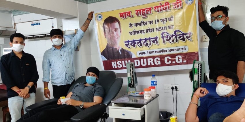 दुर्ग / शौर्यपथ / राहुल गाँधी जी के जन्मदिन उत्सव न कर के प्रत्येक जिले में रक्तदान शिविर का आयोजन भारतीय राष्ट्रीय छात्र संगठन छःग के प्रदेश NSUI अध्यक्ष आकाश शर्मा के निर्देशानुसार आज रक्तदान के कार्यक्रम का आयोजन कर रक्तदान किए कोरोना के इस संकट काल में रक्त की अतिआवश्यकता हैं। ज्यादातर ब्लड बैंक रक्त के अभाव के कारण आवश्यक आपूर्ति नहीं कर पा रहे हैं। ऐसे में दुर्ग जिला NSUI द्वारा जिला,विधानसभा पदाधिकारियों के संयुक्त नेतृत्व में चंदूलाल चंद्राकर हॉस्पिटल नेहरू नगर में 10 यूनिट ब्लड डोनेट किया गया NSUI कार्यकर्ताओं ने कांग्रेस नेता गांधी के जन्मदिन के अवसर पर रक्तदान करके कांग्रेस पार्टी के पूर्व अध्यक्ष राहुल गांधी के पचासवें जन्मदिन के रक्तदान किया राहुल गांधी जी पार्टी के भीतर सबसे लोकप्रिय युवा नेता हैं और एनएसयूआई का सबसे अधिक जुड़ाव राहुल गांधी जी के साथ है, समय-समय पर राहुल जी युवा कार्यकर्ताओं को पार्टी के भीतर कई बड़े अवसर देते रहते हैं, जिसका उदाहरण छत्तीसगढ़ में भी है।