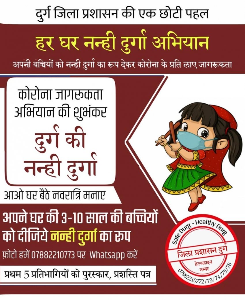 कोरोनावायरस के चलते त्योहारों की चमक फीकी ना हो इसके लिए जिला प्रशासन द्वारा एक छोटी सी पहल की गई है जिसमें आप घर पर ही रह कर नवरात्र का आनंद उठा सकते हैं। बच्चों को त्योहारों का सबसे ज़्यादा उत्साह रहता है और बच्चे एक तरह से ईश्वर का ही रूप है जो अपनी तोतली भाषा में भी कई बार बड़ा बड़ा ज्ञान भी दे जाते हैं। बच्चों के उत्साह के साथ साथ बड़े भी उनकी क्रियाओं को देख कर आनंदित होते हैं।इसलिए जिला प्रशासन द्वारा 'हर घर नन्ही दुर्गाÓ अभियान चलाया जा रहा है. जिसके तहत एक ऑनलाइन प्रतियोगिता का आयोजन किया गया है जिसमें दुर्ग जिले की 3 वर्ष से 10 वर्ष तक की बच्चियाँ हिस्सा ले सकती है।